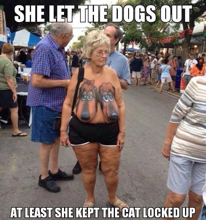 This woman really likes to walk around with her dogs showing. Well at least she has them covered up in dogs. Funny how nobody in the crowd is even noticing.