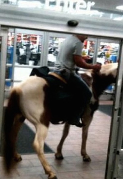Scary how Walmart lets in just about anybody. You would think the greeter would reject this type of mayhem. Although the horse looks better than many shoppers