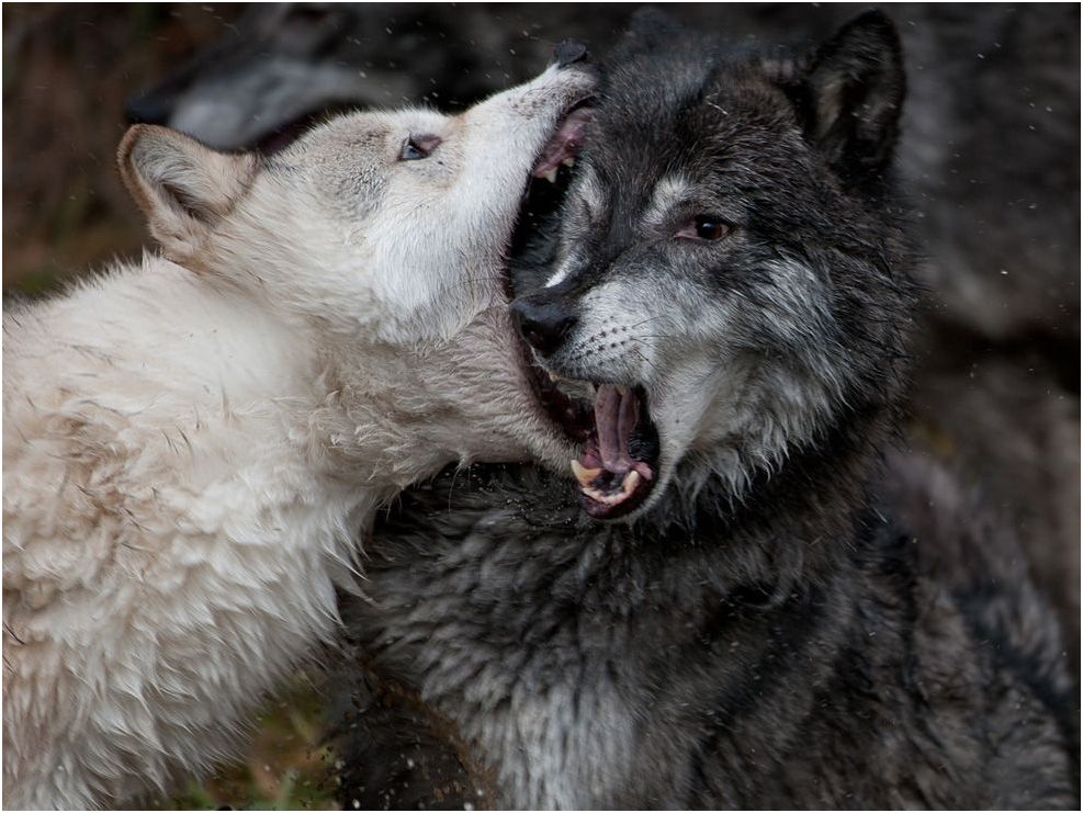 A very large juvenile male (white) challenges the alpha male (gray) for control of the wolf pack. Although it faced a formidable challenger, the alpha prevailed … for now.