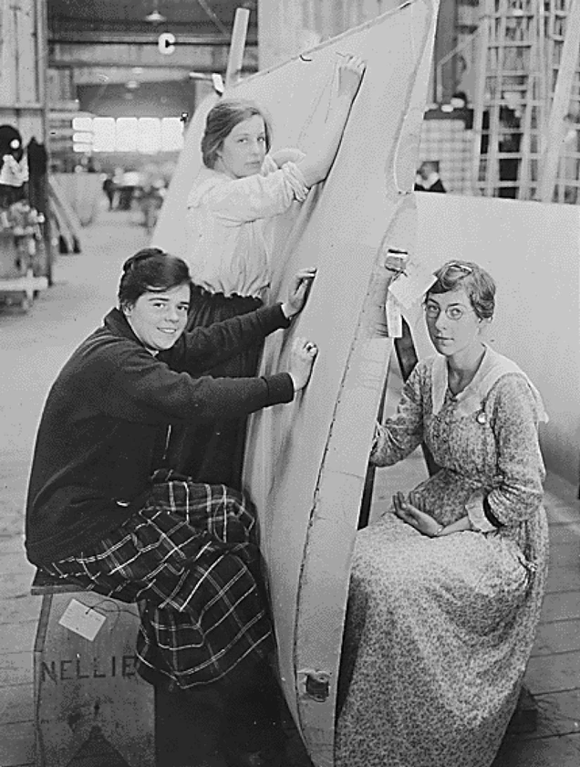Women skinning an airplane with linen ~1917