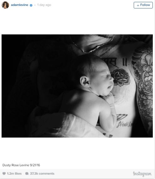 The picture posted on Instagram shows the newborn sleeping peacefully on her father's chest with the simple caption: "Dusty Rose Levine 9/21/16." There are some seriously amazing genes playing out here so no doubt she's going to grow up into an amazing woman!