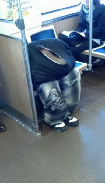 This guy really knows how to take a nap on the subway. Looks like he tucked his whole body inside his shirt. Don't know how he did it but looks warm.