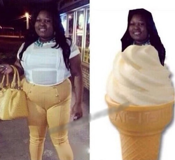 This lady couldn't have picked a worse outfit for going out on the town. She's dressed like a vanilla ice cream cone from carvel ice cream. She needs some sprinkles on top