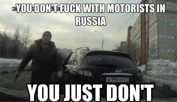 The caption says it all, You just don't F**k with motorist in russia, you just don't mess with them, or you'll get a gun pulled on you.