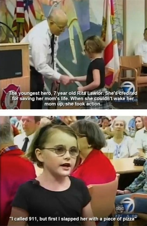 This young lady saved her mom's life by calling 911. But first she slapped her mom with a piece of pizza which is the first line of defense when somebody is unconscious.